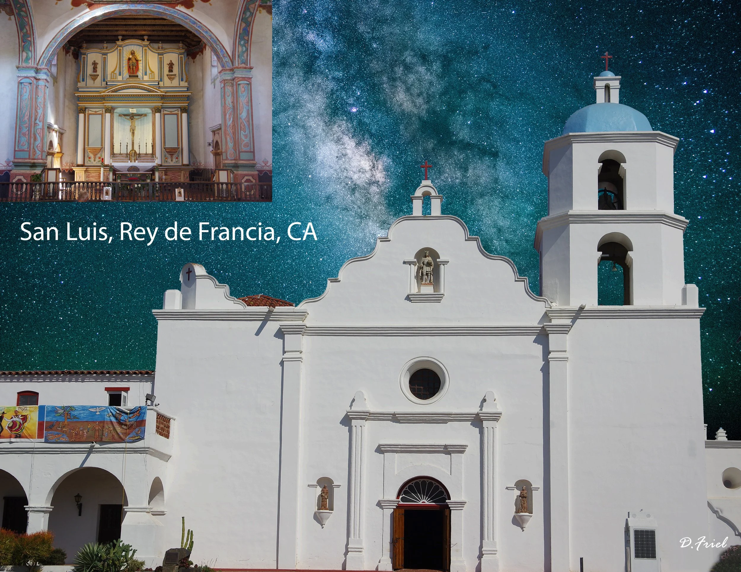 This is a blended picture of a Milky Way shot and a daytime shot of the mission San Luis, Rey de Francia, San Fransico, CA. This mission was started in 1798. An insert of the mission’s interior is also added.