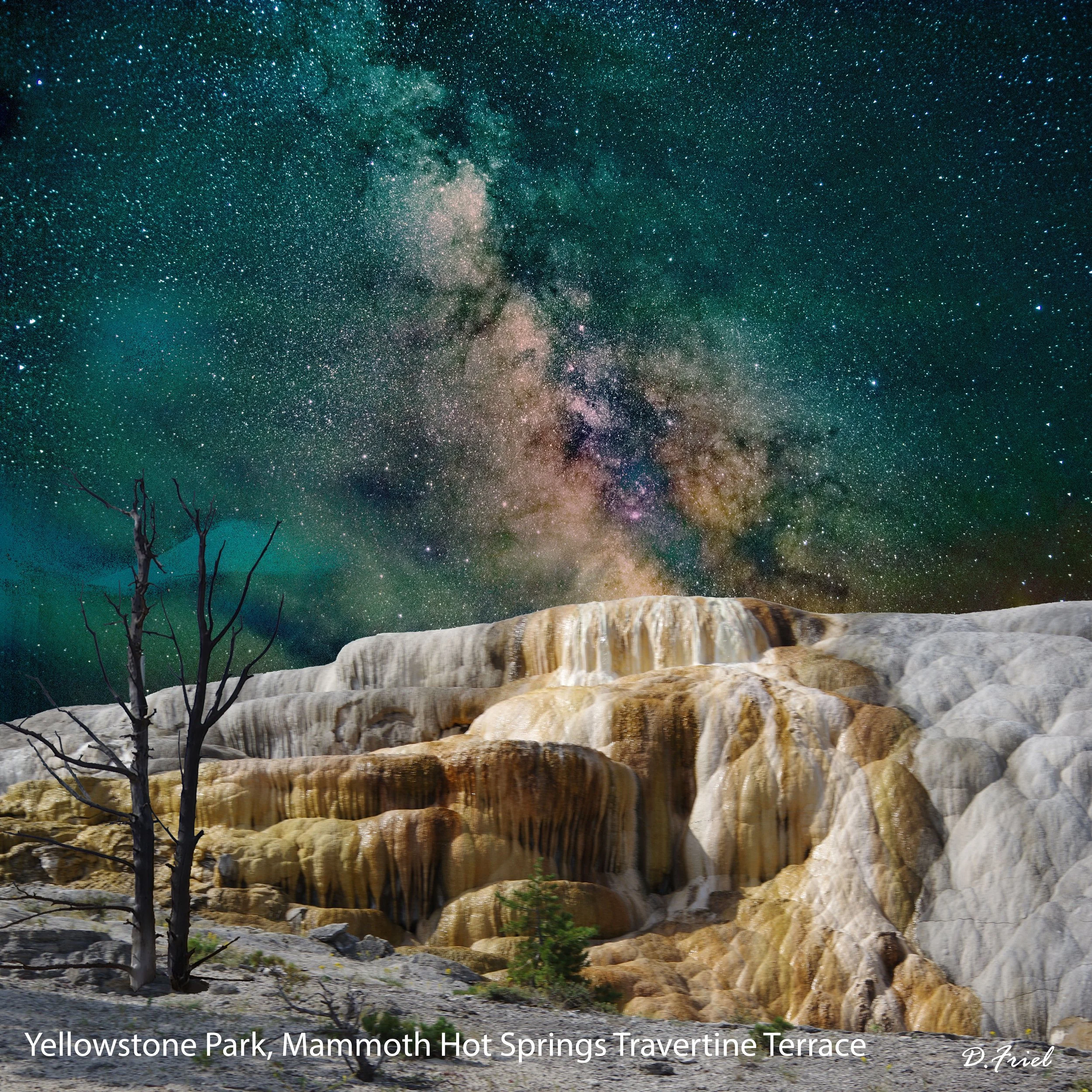 This is a blended picture of a Milky Way shot and a daytime shot of the Mammoth Hot Springs, Travertine Terrace at Yellowstone NP.